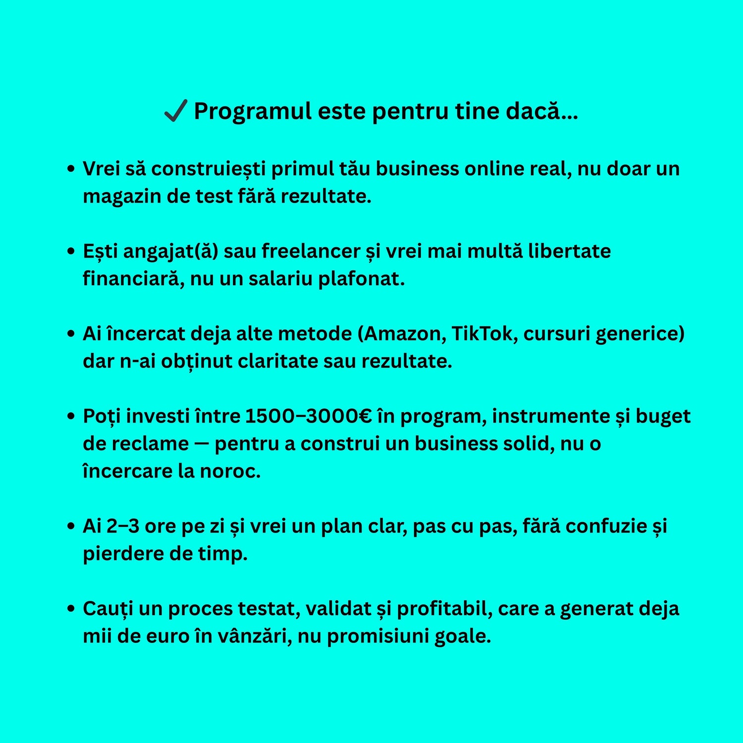 Acest program este un sistem complet care te ghidează pas cu pas spre o nouă sursă de venit- 1500-3000 euro profit lunar. Înveți cum să construiești un magazin online profitabil, să generezi venituri constante și să îți creezi un stil de viață liber, fără a mai depinde de un job tradițional.