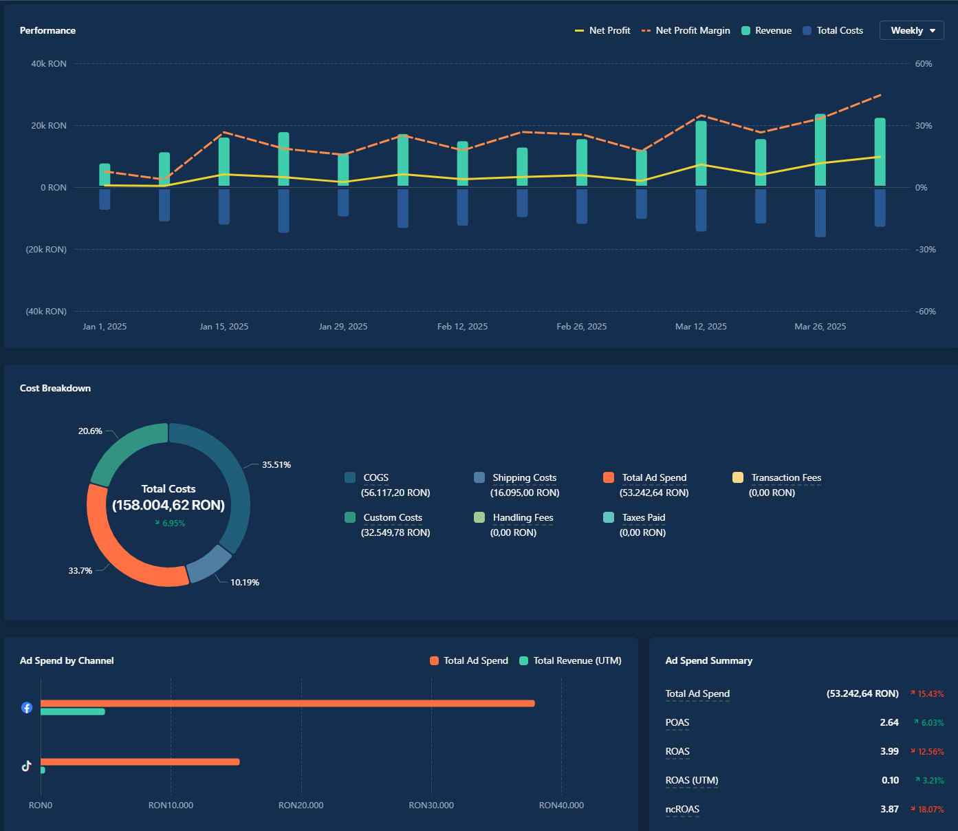 La Ecommentor folosim cele mai noi instrumente pentru calculul ROAS și profitabilitate în timp real, până la cel mai mic detaliu. În acest fel reușim să scalăm rapid fiecare magazin într-un mod responsabil.